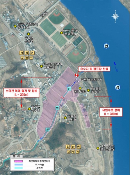 선정된 신규사업은 1998년에 처음 설치되어 운영중인 교평지구 배수펌프장을 철거하고 인근에 분당 1,680㎥의 물을 배제할 수 있는 펌프시설과 펌프시설로 유입되는 강상면 교평리 소재 신화천 약500m를 재정비하는 사업이다.