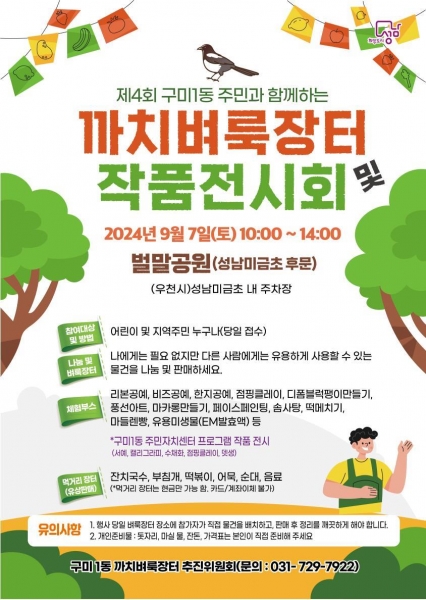 [금요저널] 성남시 분당구 구미1동 까치벼룩장터 추진위원회에서 준비한 ‘제4회 구미1동 까치벼룩장터 및 작품전시회’ 가 오는 7일 오전 10시부터 오후 2시까지 벌말공원에서 개최된다.