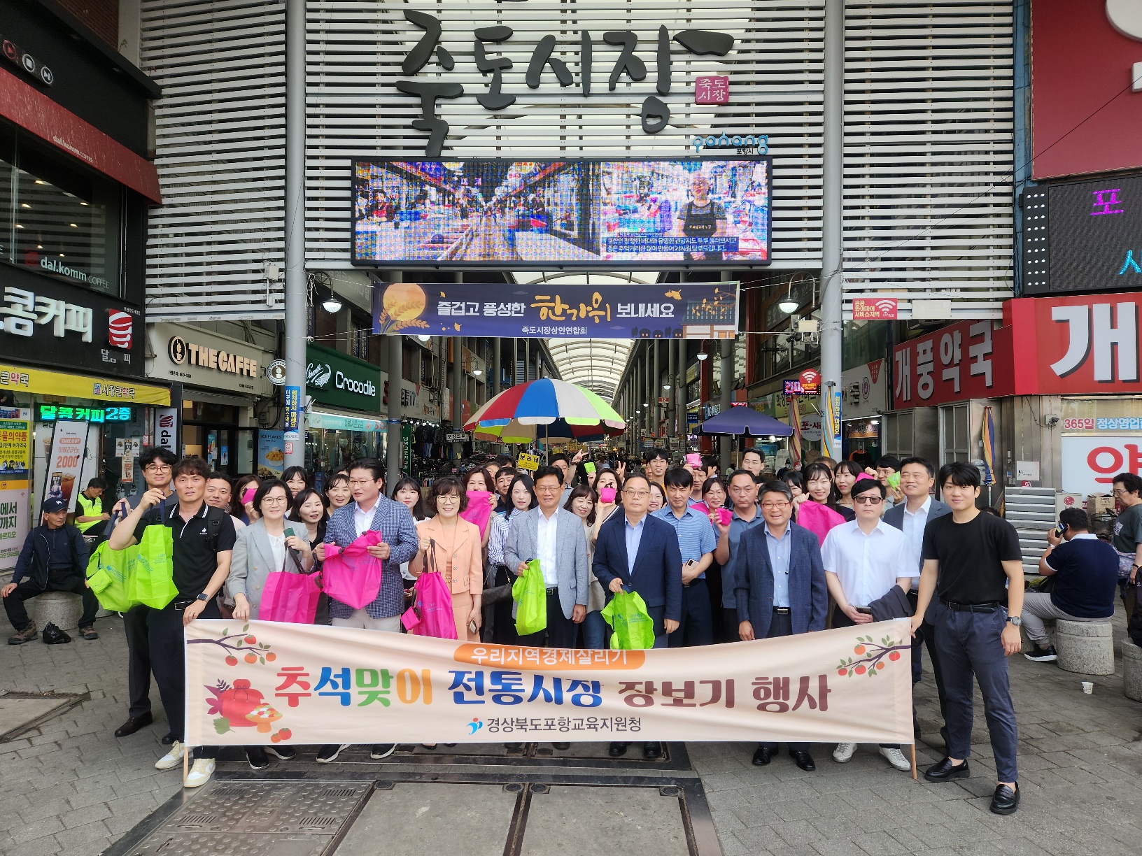 ☐ 포항교육지원청(교육장 최한용) 직원들은 추석 명절을 앞두고 9. 9.(월)에 포항 관내 여러 전통시장(죽도시장 등)을 방문해 전통시장을 활성화하기 위한 장보기 행사를 실시하였다.