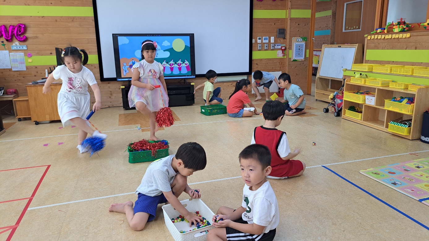 ◇ 우리나라 명절인 추석의 의미를 알아보고 전통으로 내려오는 음식, 놀이, 풍습에 대해 이야기를 나누었다. 전통문화에 관심을 가지고 자긍심을 가질 수 있는 제기차기와 비석치기, 투호놀이, 사방치기, 딱지치기, 팽이돌리기, 대형 윷놀이 등 다양한 체험활동으로 진행하였다. 특히 강강술래를 하며 유아들이 한마음으로 단합하여 진행하는 모습을 보여주기도 했다.
