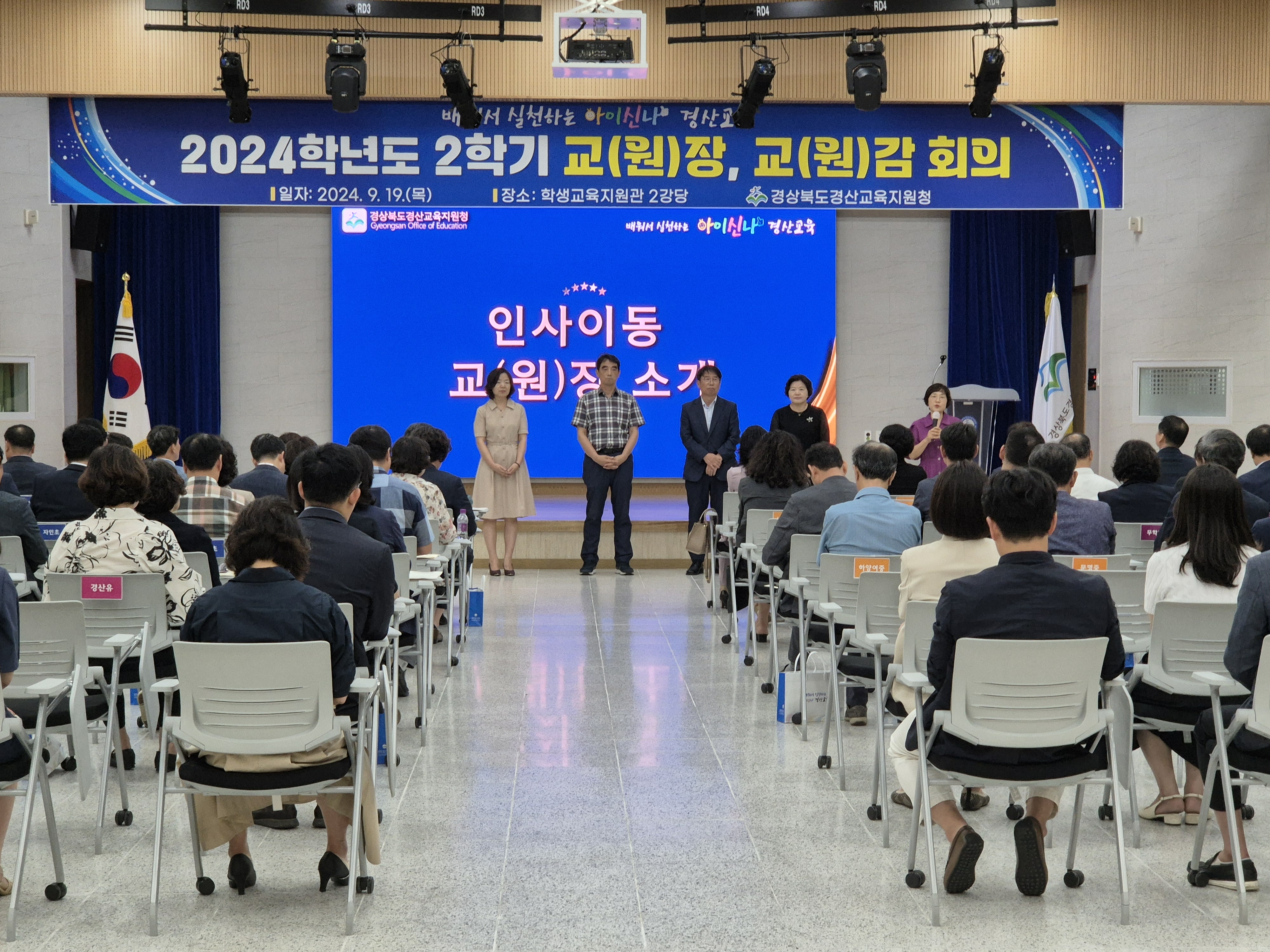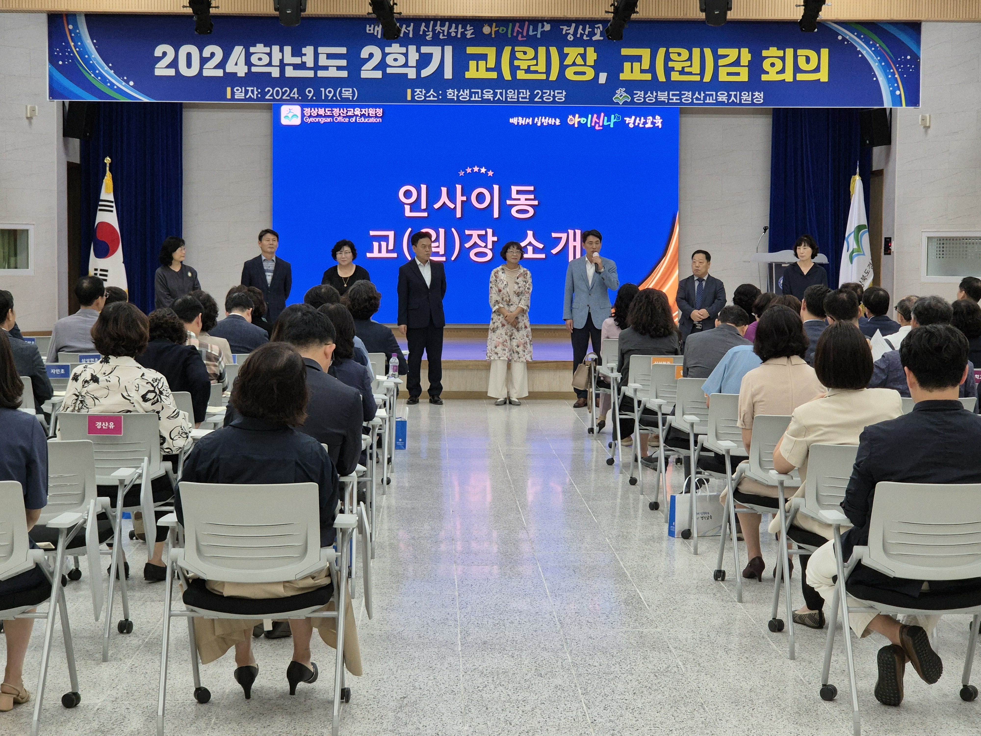 □ 경상북도경산교육지원청(교육장 박경화)은 9월 19일(목)에 학생교육지원관 2강당에서 유, 초, 중, 고, 특수, 각종학교 교(원)장 및 교(원)감을 대상으로 2024학년도 2학기 회의를 개최하였다.