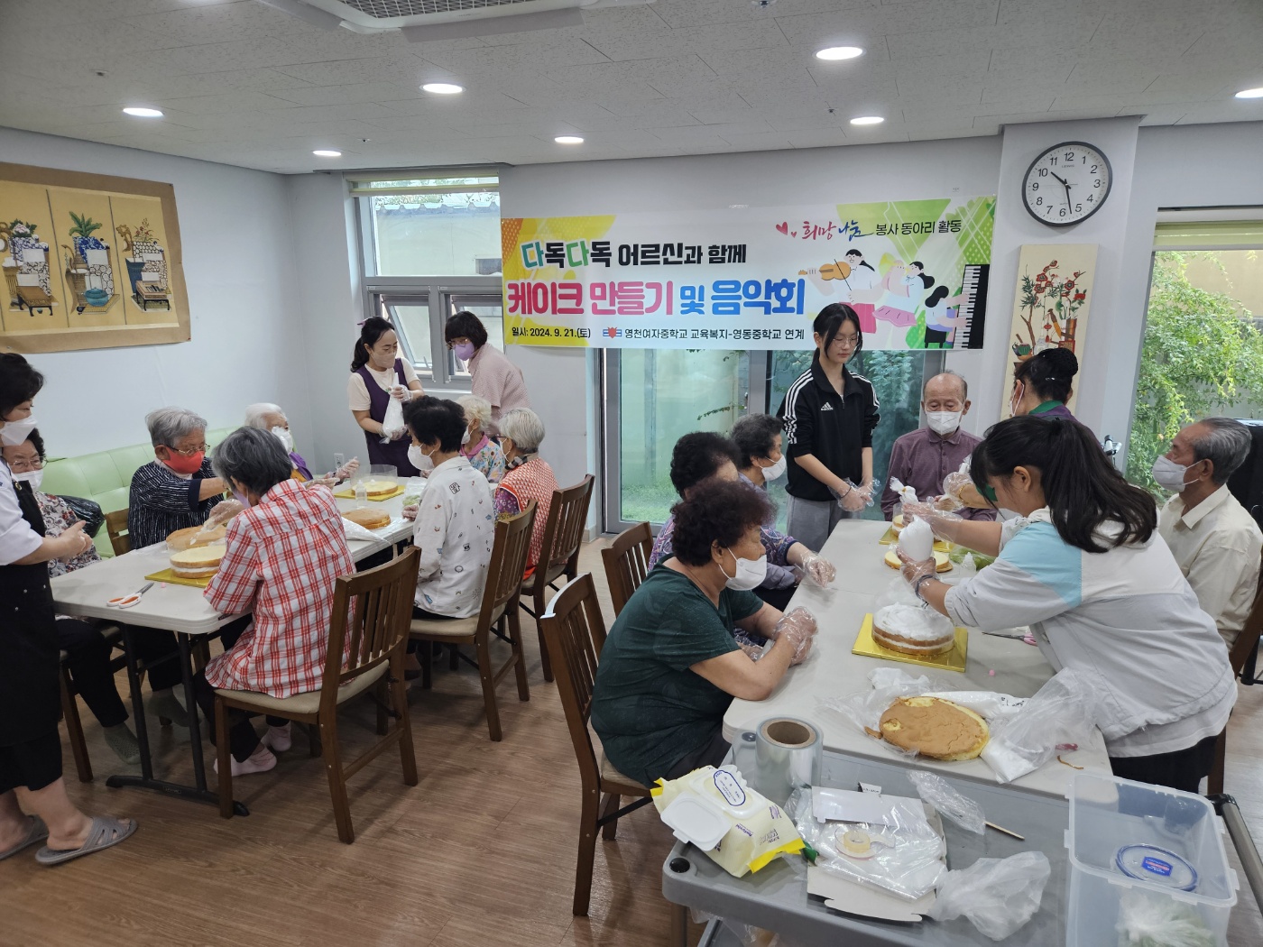 □ 영천여자중학교(교장 박정숙)는 2024년 9월 21일 토요일을 이용하여 2024학년도 함께하는 학생 봉사활동 동아리 공모에 선정되어 1~3학년 희망나눔 봉사 동아리 회원 13명 및 영동중학교 색소폰 동아리와 연계하여 “희망나눔 봉사 동아리 다독다독 어르신과 함께하는 케이크 만들기 및 음악회“를 장수요양원에서 실시하였다.