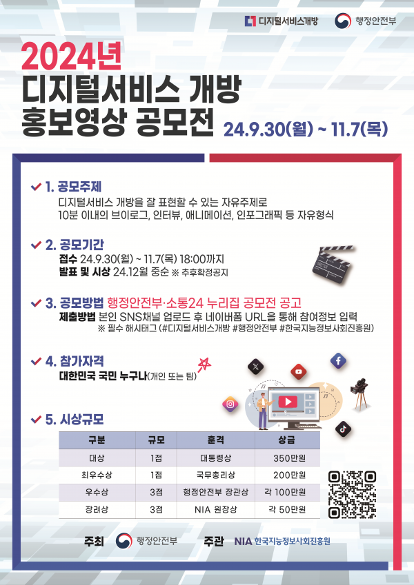 이에 행정안전부는 디지털서비스 개방 정책과 혜택을 더 많은 국민에게 효과적으로 전달해 국민의 공공서비스 접근성을 높이고자 ‘디지털 서비스 개방 홍보영상 공모전’을 올해 처음으로 개최한다.