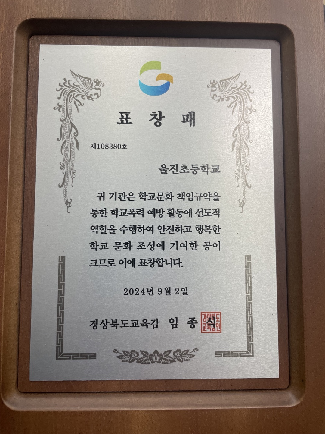 □ 울진초등학교(교장 최승란)는 학교폭력 예방을 위한 선도적 활동을 인정받아 경상북도교육감으로부터 표창패를 수상했다. 이번 표창은 울진초등학교가 학교문화 책임규약을 바탕으로 한 체계적인 학교폭력 예방 활동을 지속적으로 펼쳐온 점이 높이 평가되어 수여되었다.