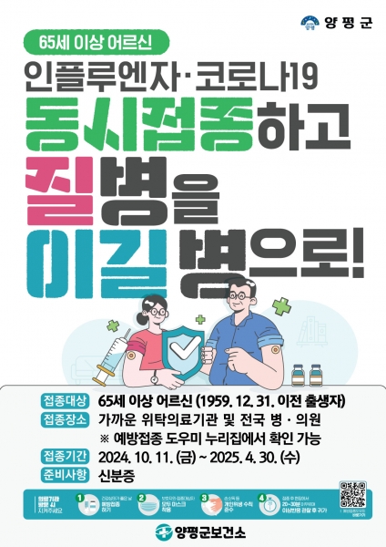 [금요저널] 양평군은 11일부터 65세 이상 어르신을 대상으로 지정 의료기관에서 독감·코로나19 예방 접종을 무료로 실시한다고 밝혔다.