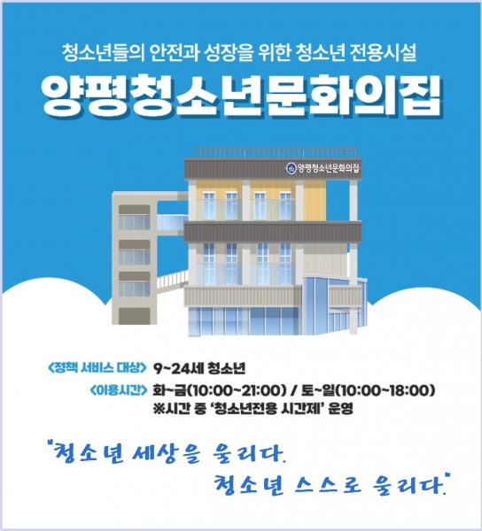 양평청소년문화의집은 양평군이 청소년기본법에 의거 설립한 세 번째 청소년수련시설로 민선 8기 ‘돌봄과 배려의 보건복지–청소년 문화활동 시설확충 및 지원강화’ 공약 이행으로 건립된 청소년 전용 시설이다.