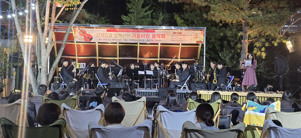 - 현동중학교(교장 김양훈)는 10월 7일(화) 오후 7시 교내 야외 무대에서 지역민과 함께하는 가을바람 음악회를 실시하였다.