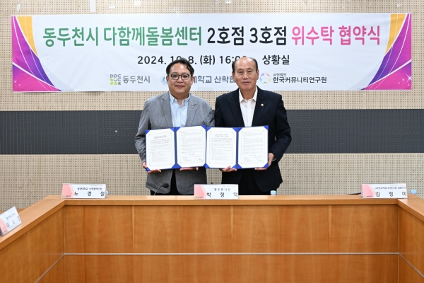 [금요저널] 동두천시는 8일 시청 상황실에서 다함께돌봄센터 2호점 수탁기관인 동양대학교 산학협력단과 3호점 수탁기관인 한국커뮤니티연구원과 센터 운영 및 효율적인 돌봄 서비스 제공을 위한 위수탁 계약을 체결했다고 밝혔다.