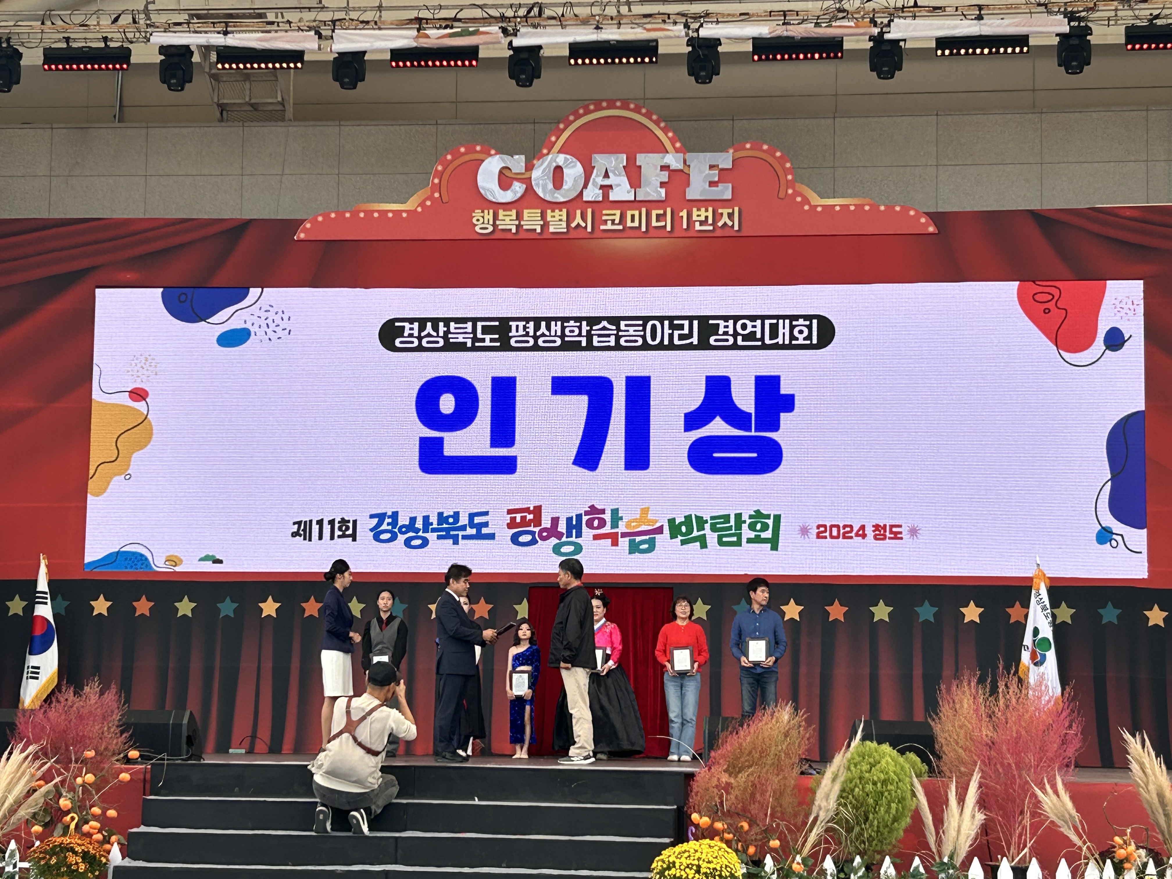 영천교육지원청(교육장 김희수)은 지난 13일(일) 청도군 청도국민체육센터 야외공연장에서 개최된‘제11회 경상북도평생학습박람회 동아리 경연대회에 영천 동부초 국악오케스트라-우리 소리 찾아가는 아이들 팀이 참가했다. 이 대회에는 경북 19개 시·군 대표 학습동아리팀이 출전하여 기량을 뽐내며 치열한 경쟁을 한 가운데, 영천팀의 공연명“신뱃놀이”가 작품의 예술성 및 관객호응도가 가장 높은 인기상이라는 큰 상을 수상하였다.