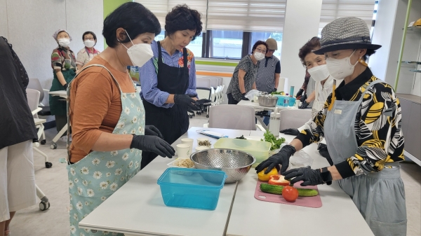 특히 비만·당뇨·고혈압 등에 채소 식습관이 얼마나 중요한지, 어떤 식재료를 어떻게 먹어야 치매와 만성질환을 예방하고 건강하게 장수할 수 있는지를 교육한 후, 독일야채 국수, 치커리미역샐러드, 오이고추 멸치샐러드 등을 함께 만들어 먹어보며 참여자들에게 큰 호응을 얻었다.