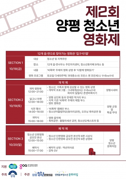 ‘제2회 양평청소년영화제’는 ‘비폭력, 일상에 스며드는 청소년 자기형성’을 주제로 오는 18일부터 20일까지 총 3일간 개최되며 찾아가는 사전영화제를 시작으로 본격적인 영화제 개막 행사와 청소년단편영화공모전 본선 진출작들의 상영회가 이어질 예정이다.