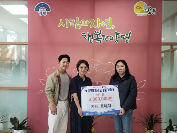 [금요저널] 양평군 용문면에 위치한 카페 트레져는 16일 용문면사무소를 방문해 지역 내 어려운 이웃을 돕기 위한 성금 3백만원을 기탁했다.