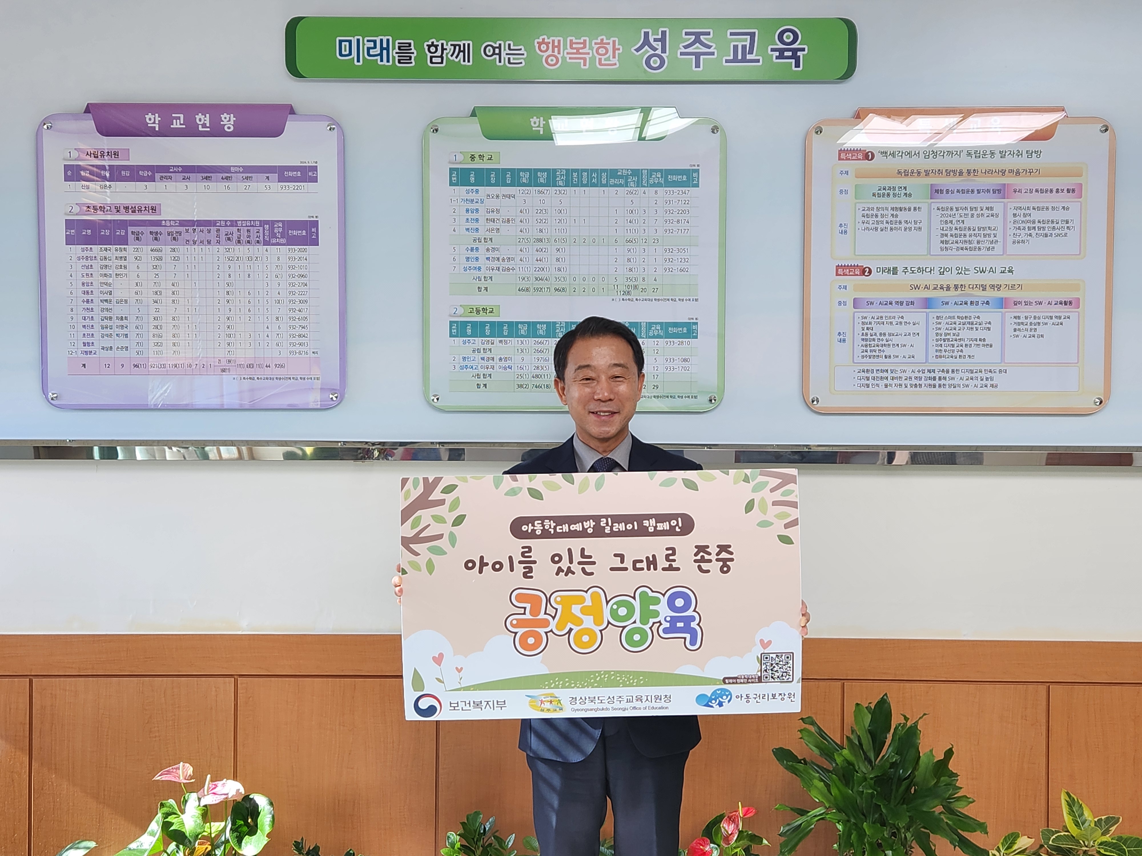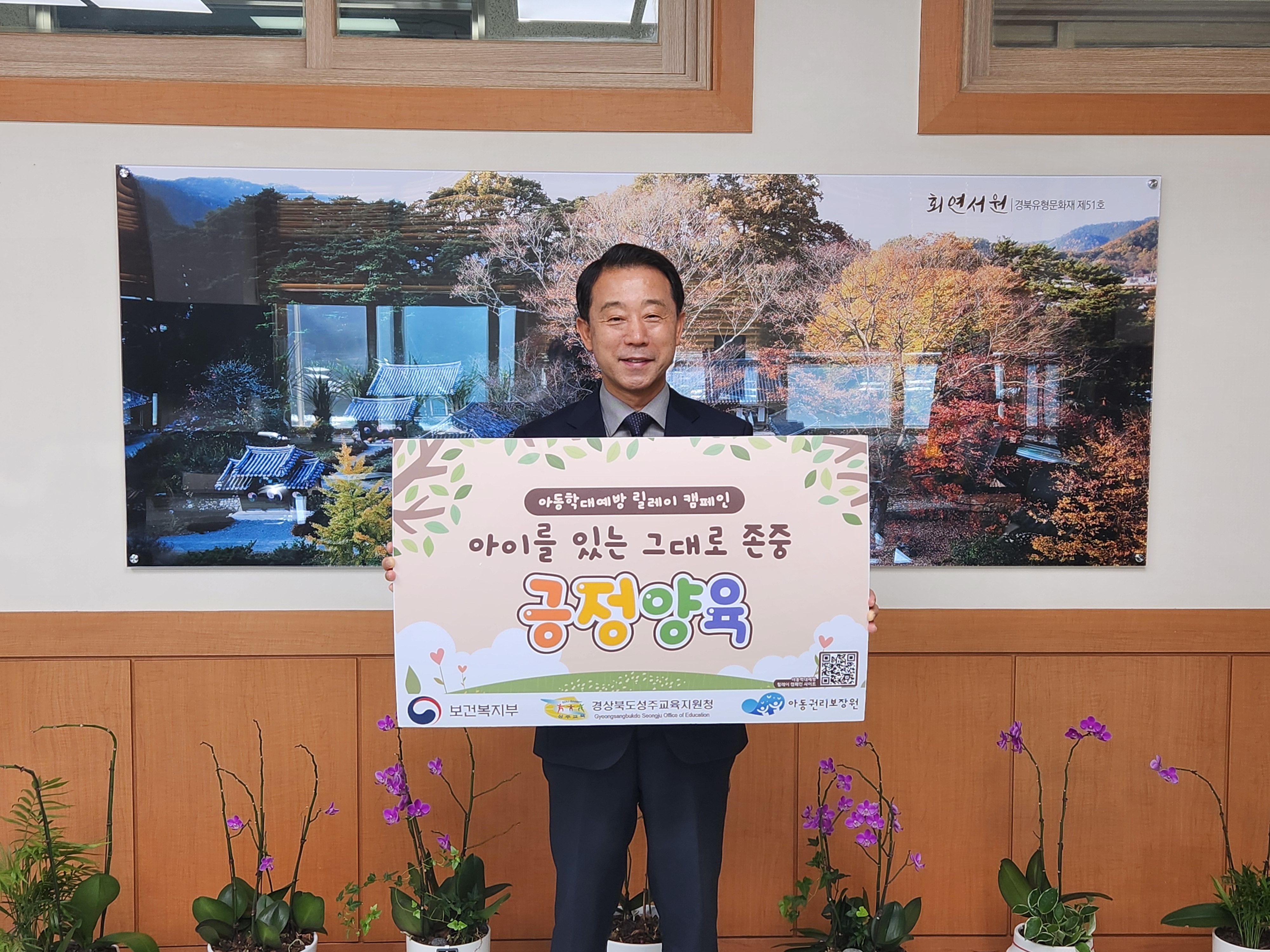 □ 경상북도성주교육지원청 정수권 교육장은 10월 23일(수) ‘아이를 있는 그대로 존중, 긍정양육’을 주제로 진행중인 아동학대예방 릴레이 캠페인에 동참했다.