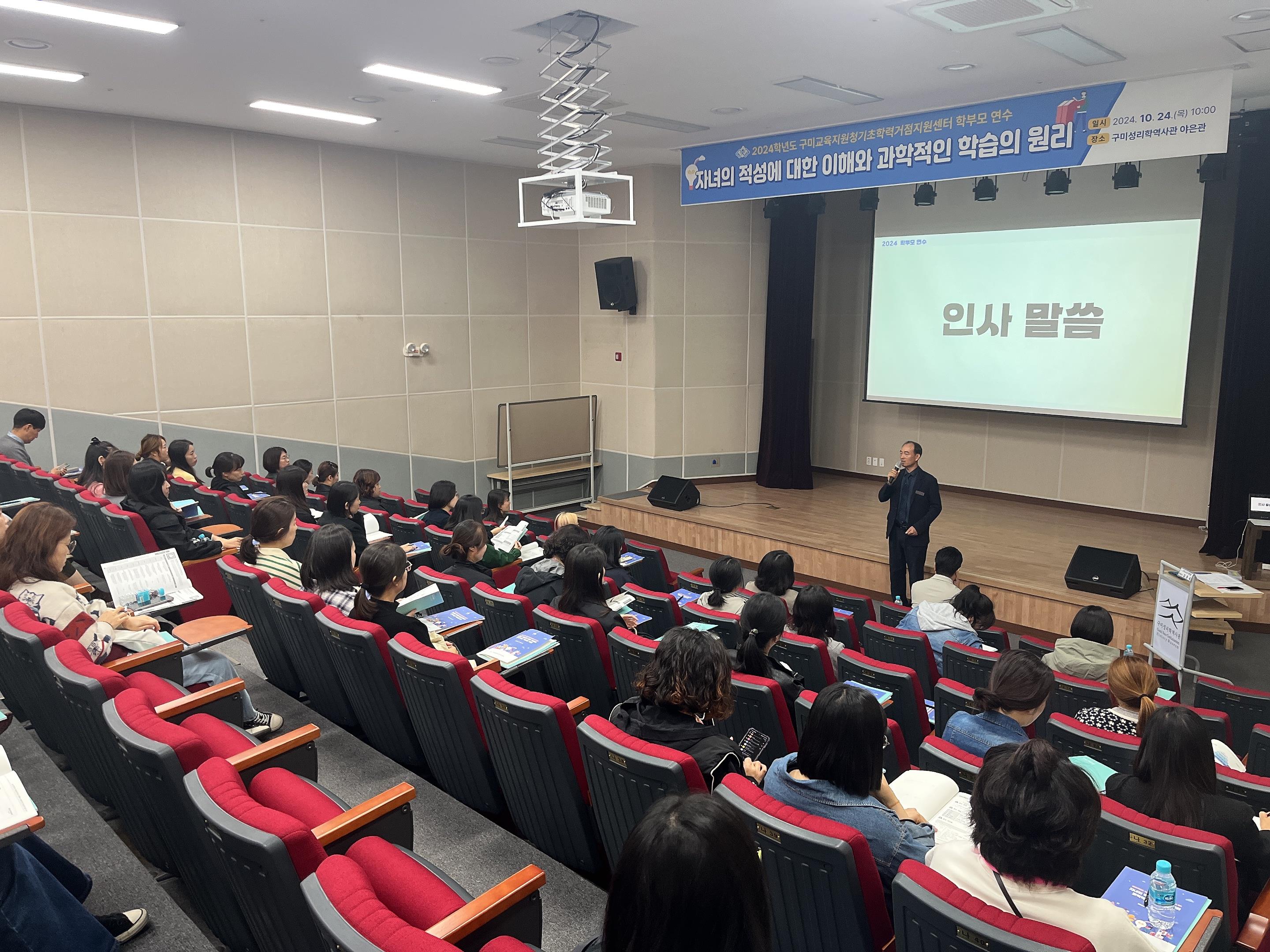 □ 경상북도구미교육지원청(교육장 남성관) 기초학력거점지원센터는 10월 24일(목) 구미, 김천 지역 초등학생 학부모 120명을 대상으로 진로교육 연수를 실시하였다.