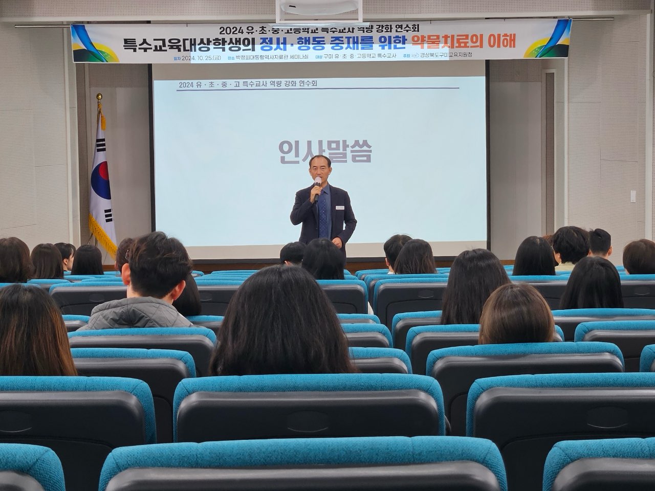 경상북도구미교육지원청(교육장 남성관)은 10월 25일(금) 박정희대통령역사자료관 세미나실에서 유·초·중·고등학교 특수교사 100명을 대상으로 ‘특수교육대상학생의 정서·행동 중재를 위한 약물치료의 이해’를 주제로 특수교사 역량 강화 연수를 실시하였다.