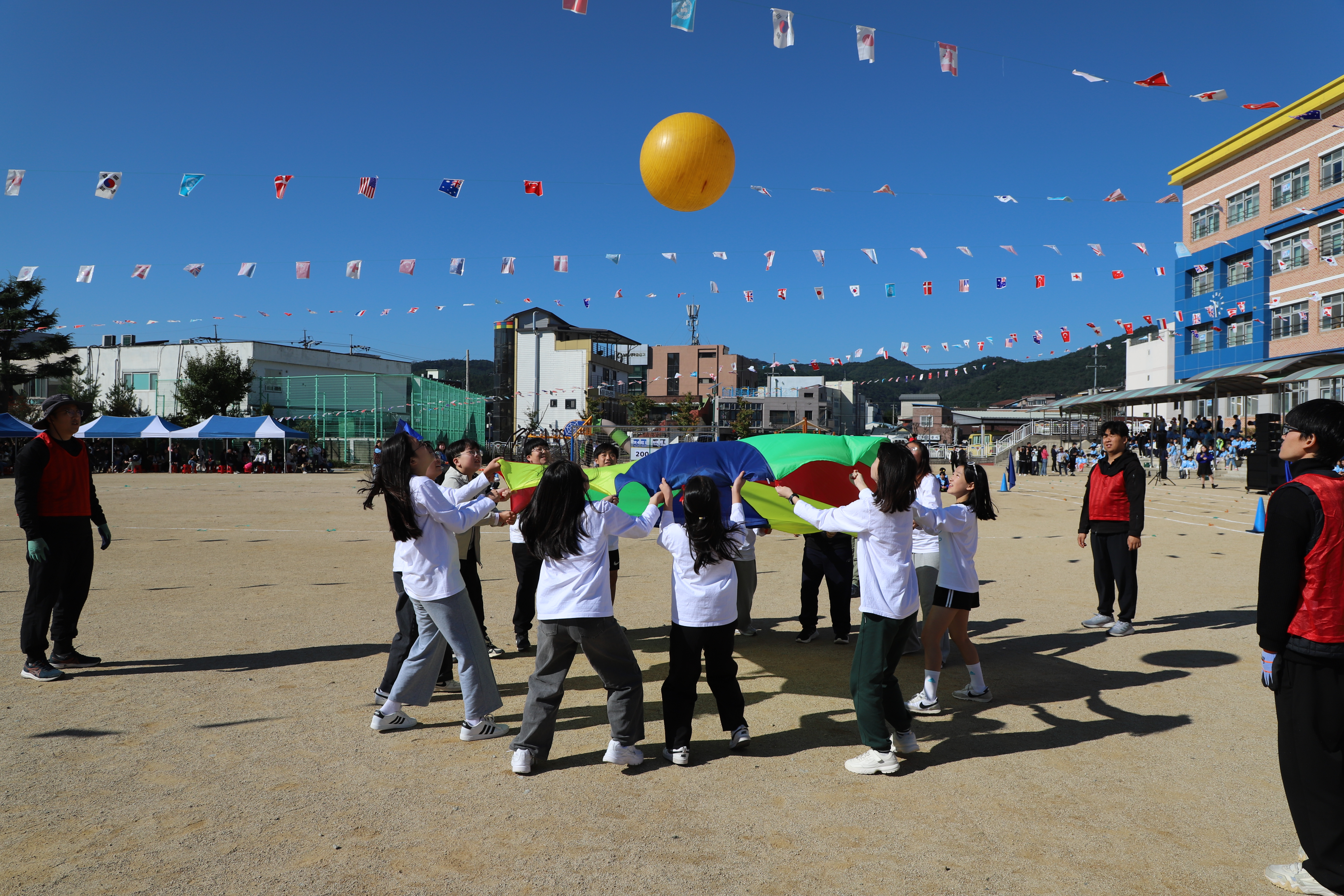 □ 가을 한마당 체육대회는 본교 병설유치원 원생들과 본교 5학년 학생의 식전 공연을 시작으로 다양한 경기(학년별 개인 달리기, 콩주머니 넣기, 줄다리기, 이어달리기 등)를 계획하여 이루어졌다. 각 팀을 응원하기 위한 응원전도 이루어졌다.
