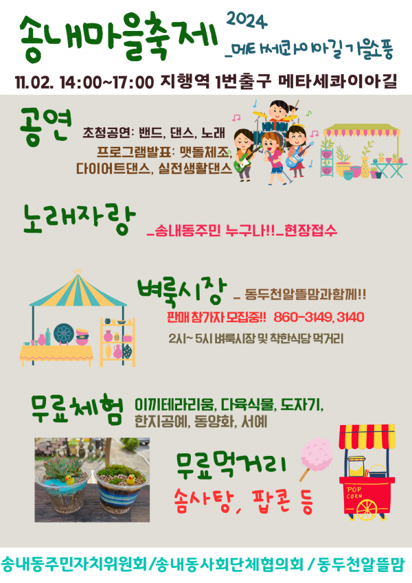 임은승 송내동장은 “주민자치위원들께서 몇 달 동안 성공적인 마을 축제를 기획하기 위해 노력하셨는데, 많은 주민들이 참여하고 만족하는 축제가 되기를 기대한다”고 전했다.