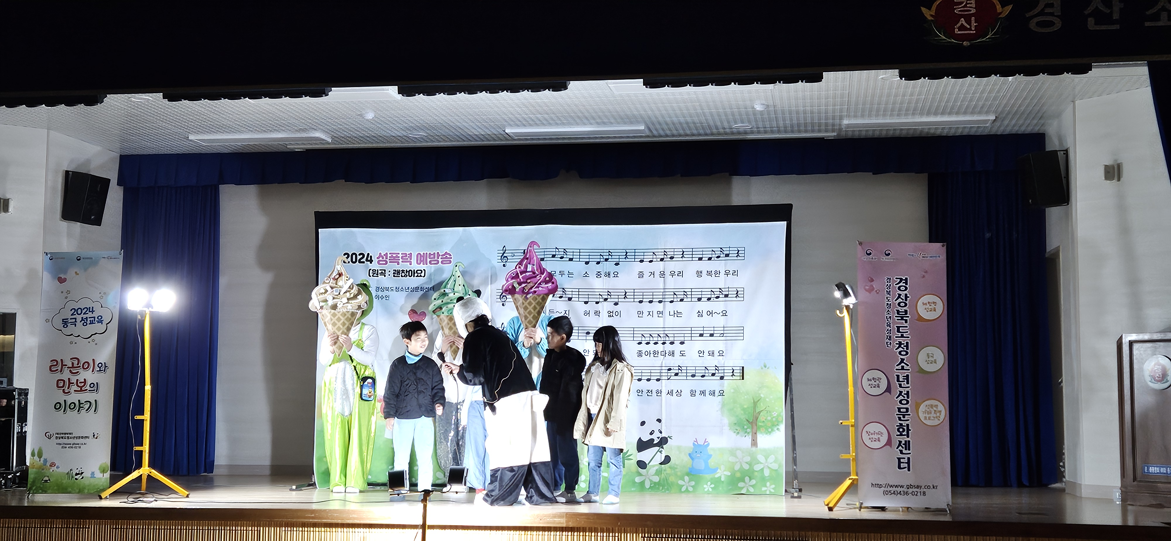 □ 공연을 본 후 1학년 김ㅇㅇ은 “우리는 모두 소중한 사람이에요.” 3학년 이ㅇㅇ은 “친한 친구사이라도 다른 사람의 몸을 만지려고 할 때는 꼭 허락을 받아야 해요.”라고 말하였다. 경산초 어린이들은 주인공 라군이를 응원하고 ○,×퀴즈를 풀며 공연에 함께 참여하고 다함께 성폭력 예방송을 큰소리도 합창 하는 등 공연에 집중하는 모습이었다.