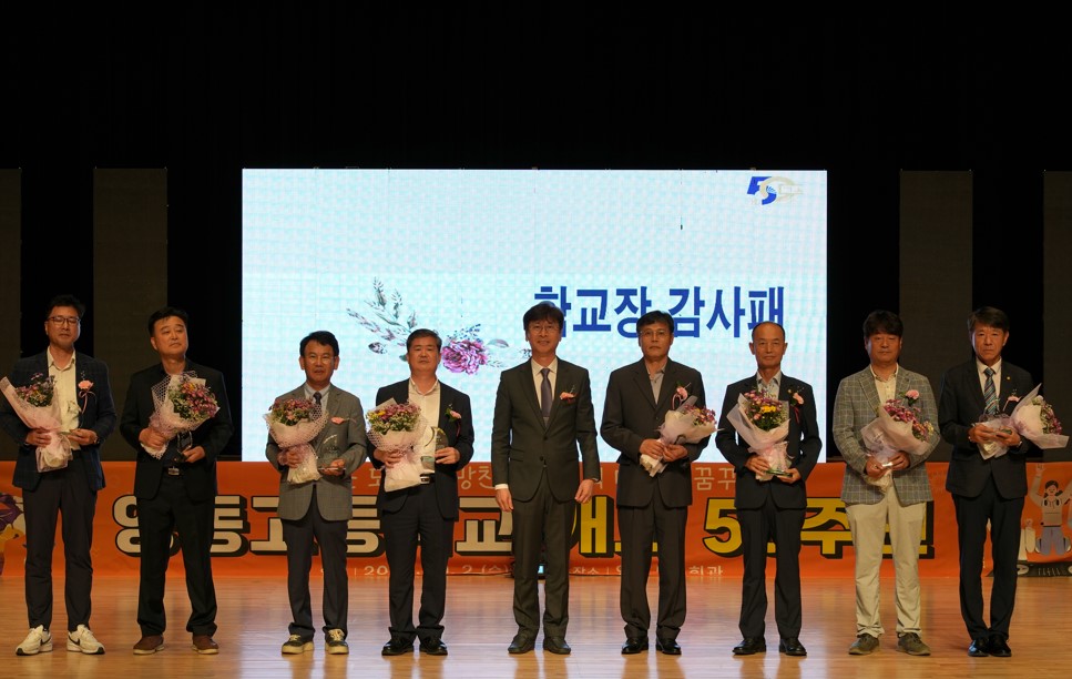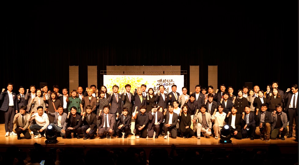 영동고등학교(교장 최종병)는 지난 10월 2일(수) 영천시민회관에서 개교 50주년 기념식 및 기념행사를 개최했다. 1974년 개교 이래 올해로 50번째 생일을 맞이한 영동고는 ‘새로운 도전, 희망찬 100년의 미래를 꿈꾸다’란 슬로건을 앞세워 학생 및 학부모, 동창회, 지역 인사 등 교내외 내빈 600여명을 모시고 이 날을 기념했다. 본식에 앞서 영동고 대표 밴드 동아리 ‘야자나무’를 시작으로 초청 가수들의 열정적인 공연을 통해 행사의 분위기가 한층 고조되었으며 의례 무거운 분위기의 기념식이라 생각하고 참석한 학생들은 축제 분위기에 흥분을 감추지 못했다.