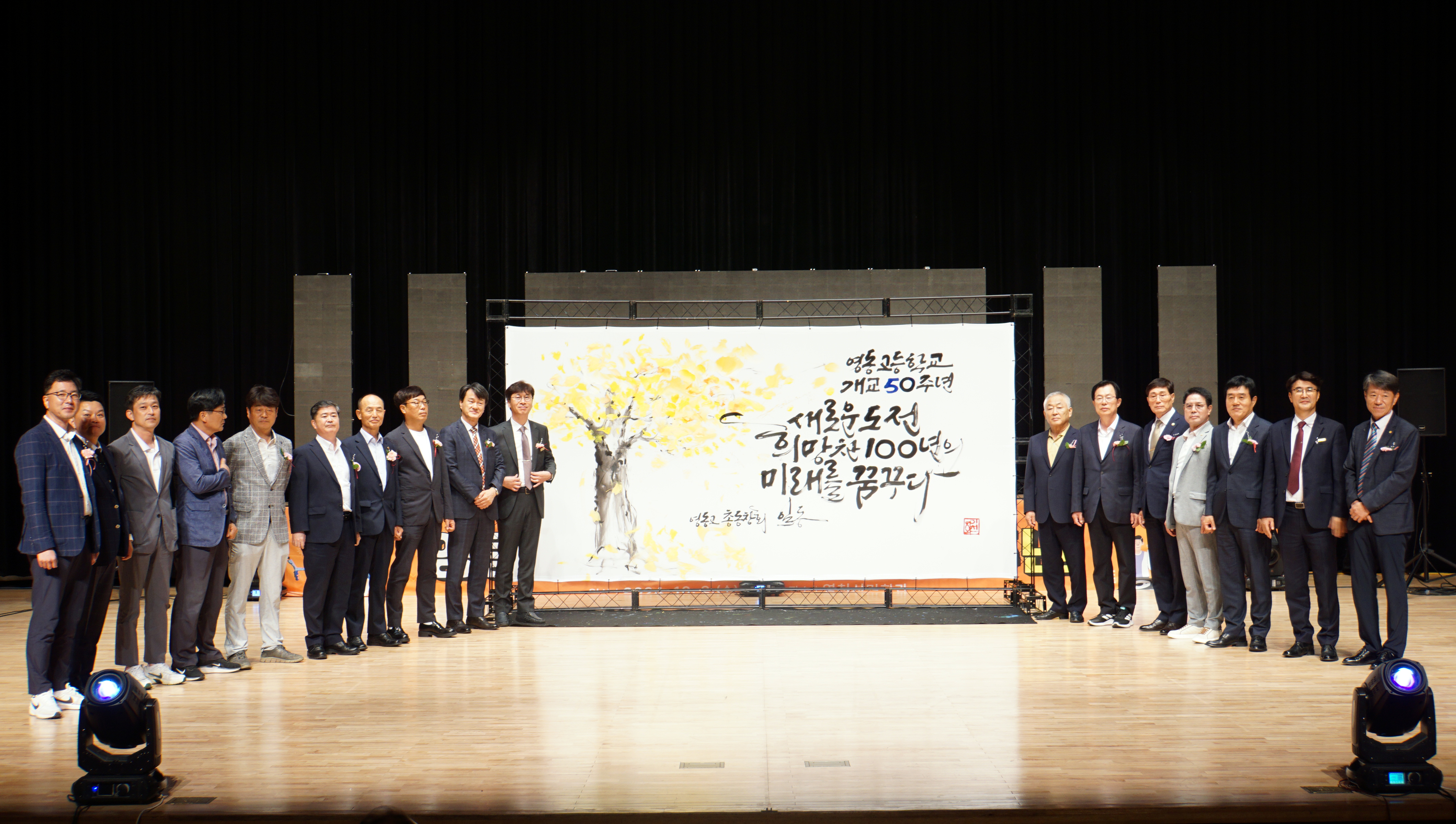 개교 50주년 행사의 피날레는 ‘캘리그라피 퍼포먼스 공연’이었다. 총동창회 주관으로 초청한 이화선 작가는 개교 50주년을 기념하는 의미 있는 작품을 선사했다. 이 작가는 영동고의 교목인 은행나무 아래 슬로건‘새로운 도전, 희망찬 100년의 미래를 꿈꾸다’를 붓글씨로 표현한 한 폭의 작품을 완성하였고, 이를 지켜본 모든 이들은 작품에 대한 벅찬 감동과 흥분을 큰 박수와 함성으로 표현하며 이 날을 기억할 수 있게 되었다. 또한, 무대 위 작품 앞에서 행사에 참석한 모두가 함께 한 교가 제창도 개교 50주년의 멋진 한 장면으로 기억할 수 있게 되었다.