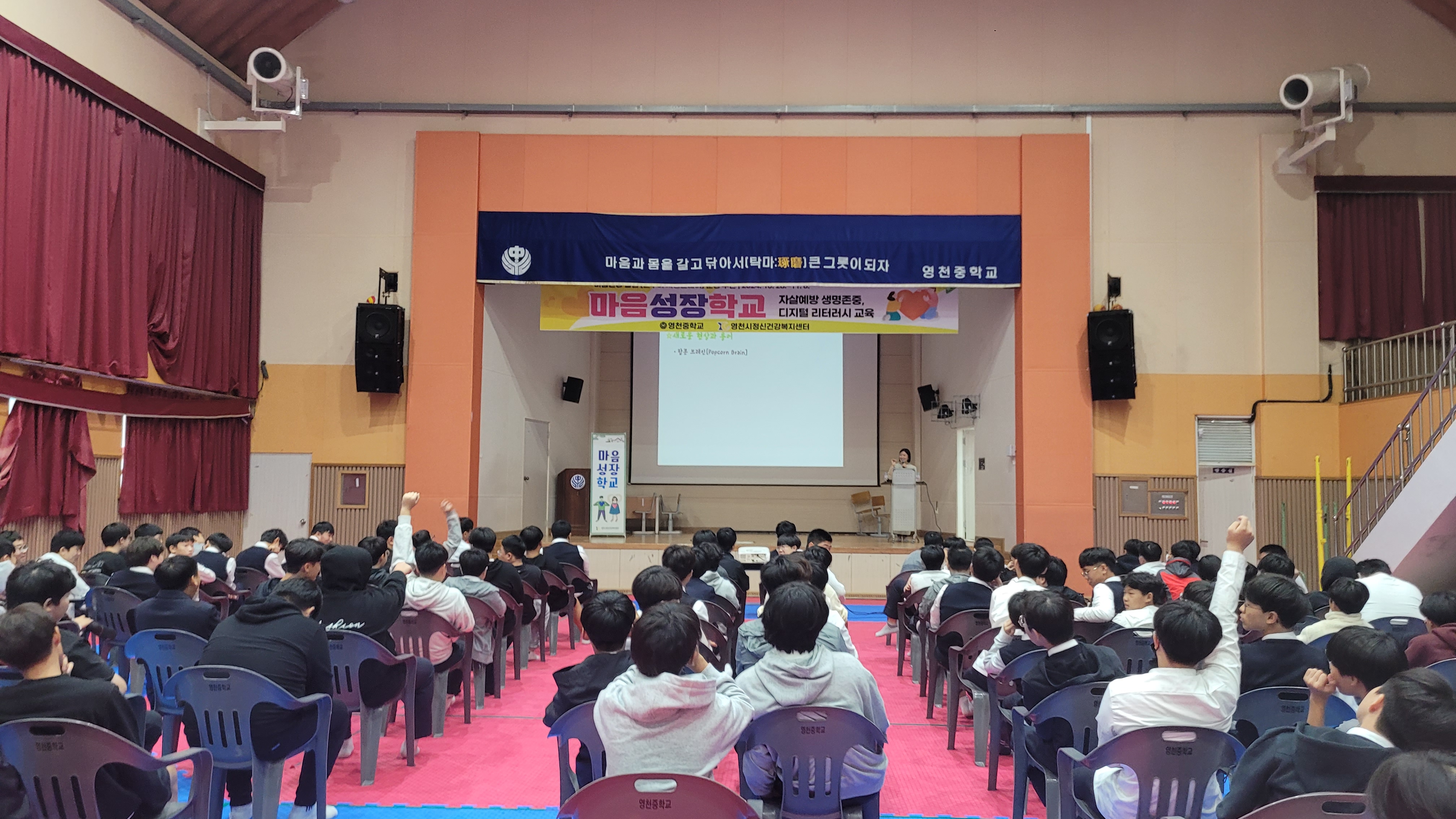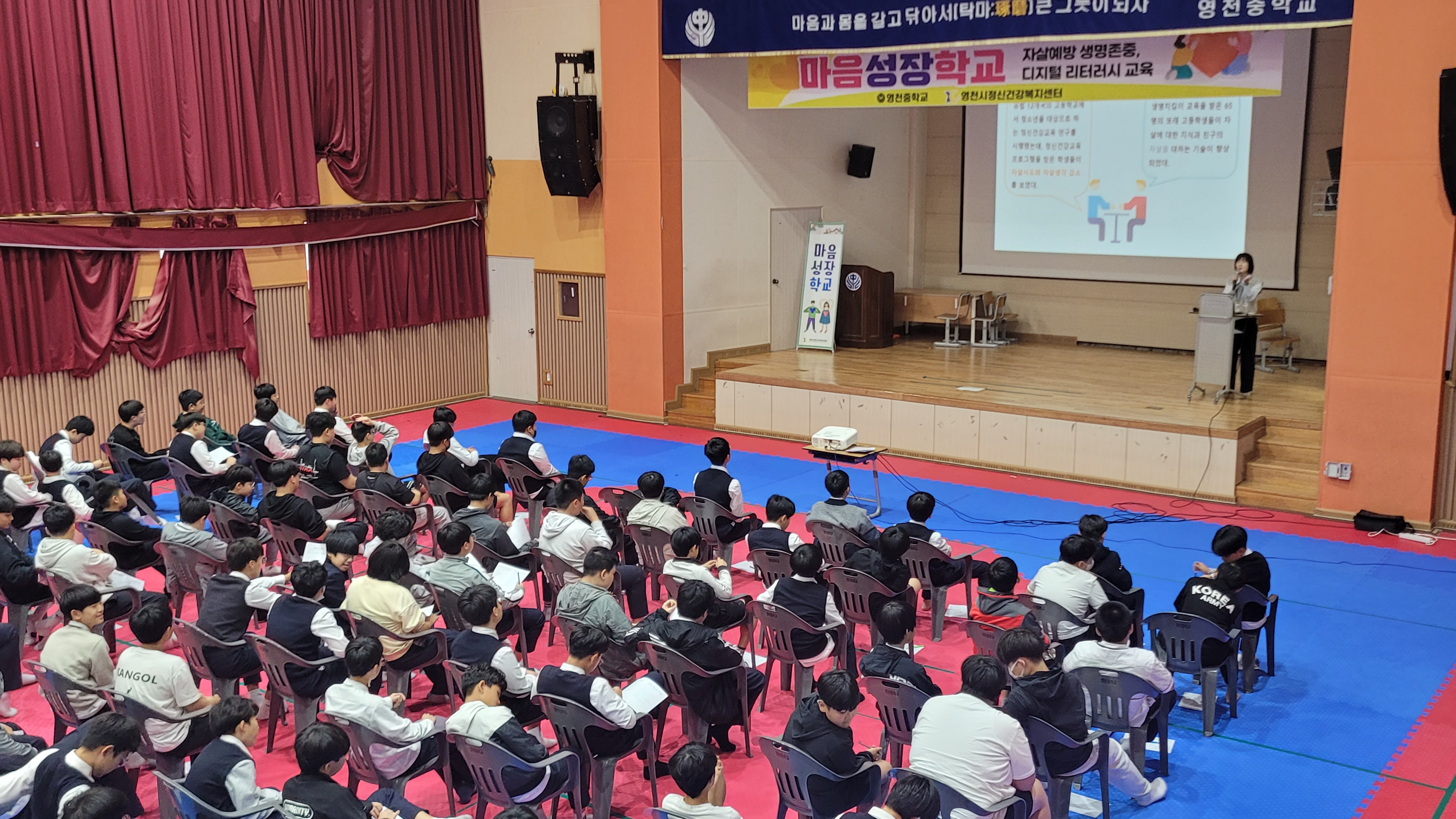 영천중학교(교장 김정남)는 10월 28일 탁마관에서 영천시정신건강복지센터와 마음성장학교 자살예방 생명존중 및 디지털 리터러시 교육을 실시하였다.