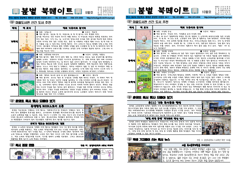 - 춘양초등학교(교장 이영관)는 학생, 교사, 학부모가 함께하는 책 읽기로 책 읽는 교육공동체 문화 조성에 기여하기 위해 독서 신문 ‘봄볕 북메이트’를 매월 발간하고 있다.