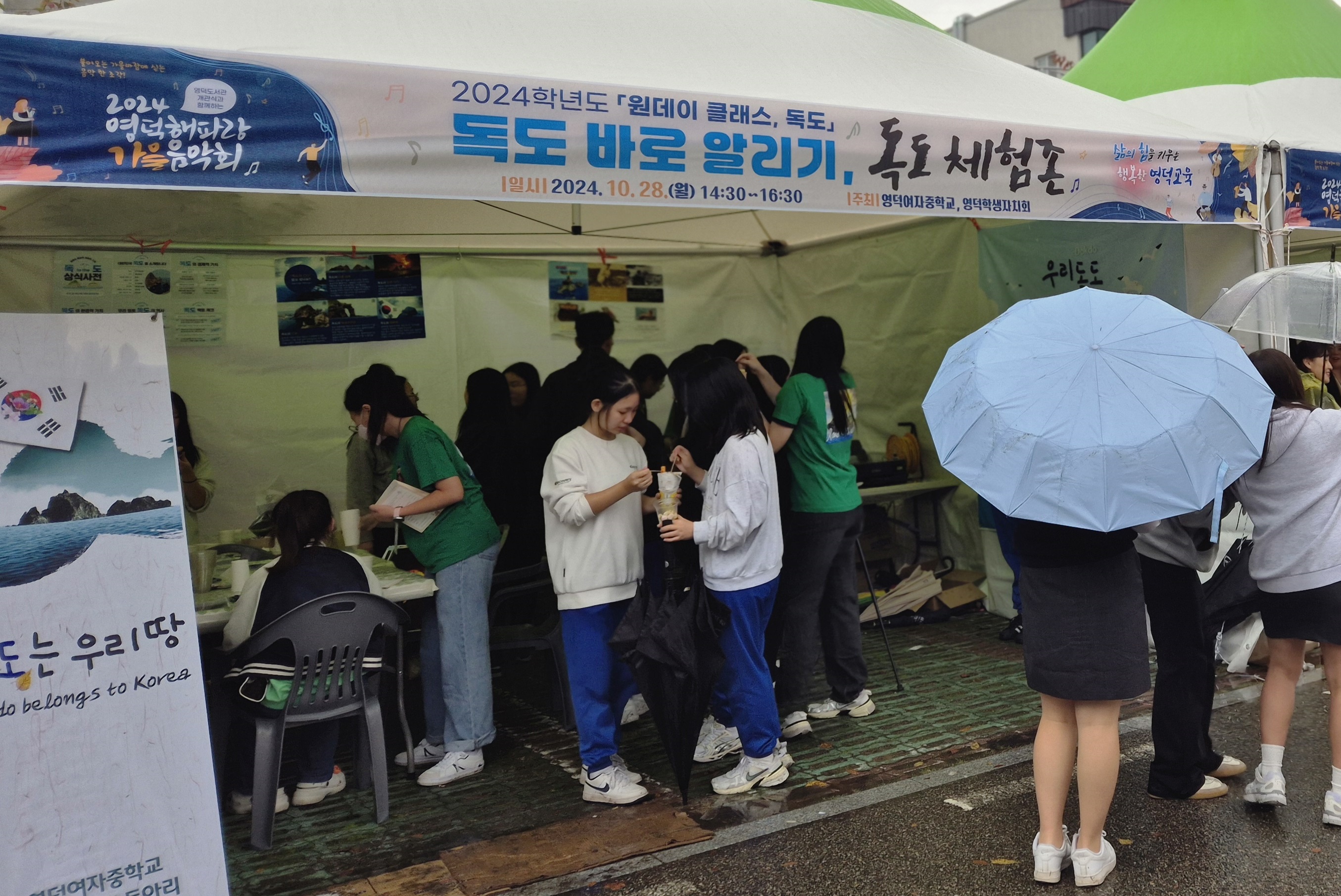 □ 「원데이 클래스, 독도」는 바다와 함께하는 독도 일일 체험, 독도 사랑 부스 운영, 독도 교육 담당 교사 역량 강화 연수 등 학교별 실정을 고려한 다양하고 교육적인 프로그램으로 구성되었다. 특히 독도지킴이 동아리가 있는 영덕여자중학교에서는 독도 사랑 부스 운영을 통하여 지역사회와 연계한 다양한 체험활동 요구에 부응한 모범적인 사례였다.