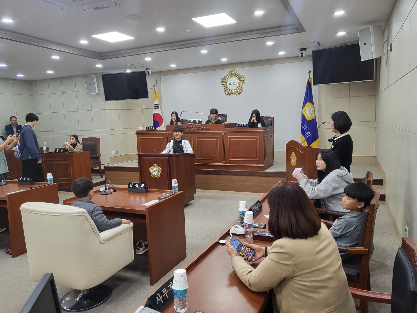 영덕군의회에서는 의장과 의원들이 직접 학생들을 마중하여 학생들이 편안한 마음으로 의회를 둘러볼 수 있었다. 의회 회의실에 들어가 의장, 의사팀장, 군수 자리에 학생들이 앉아 더 나은 학교를 위한 방법을 주제로 학생회 회의를 시작하였다. 처음에는 생소한 분위기에 얼어 있던 학생들도 의회 공무원들의 도움으로 회의 막바지에는 모두 참여할 수 있는 분위기로 바뀌었다.