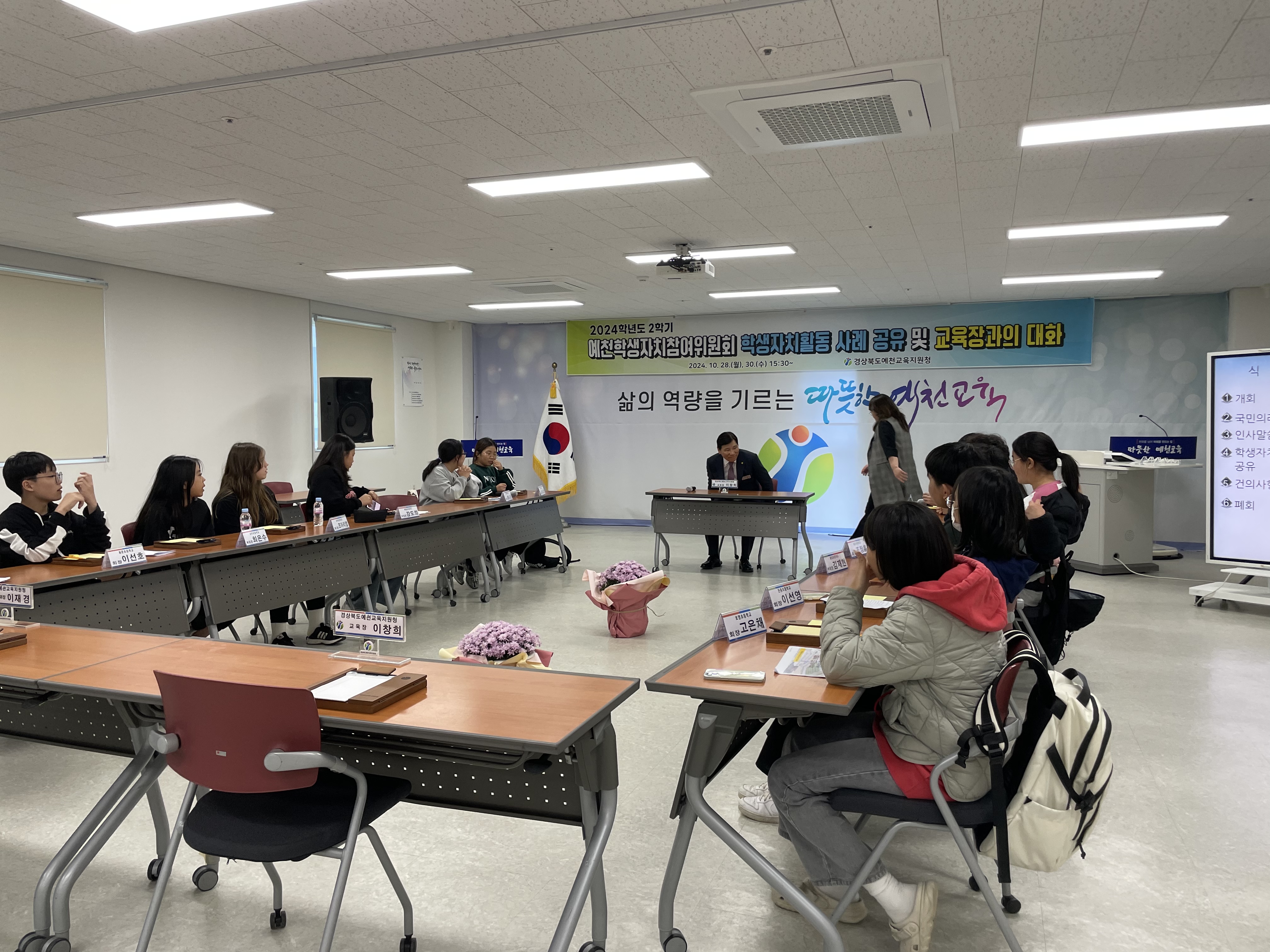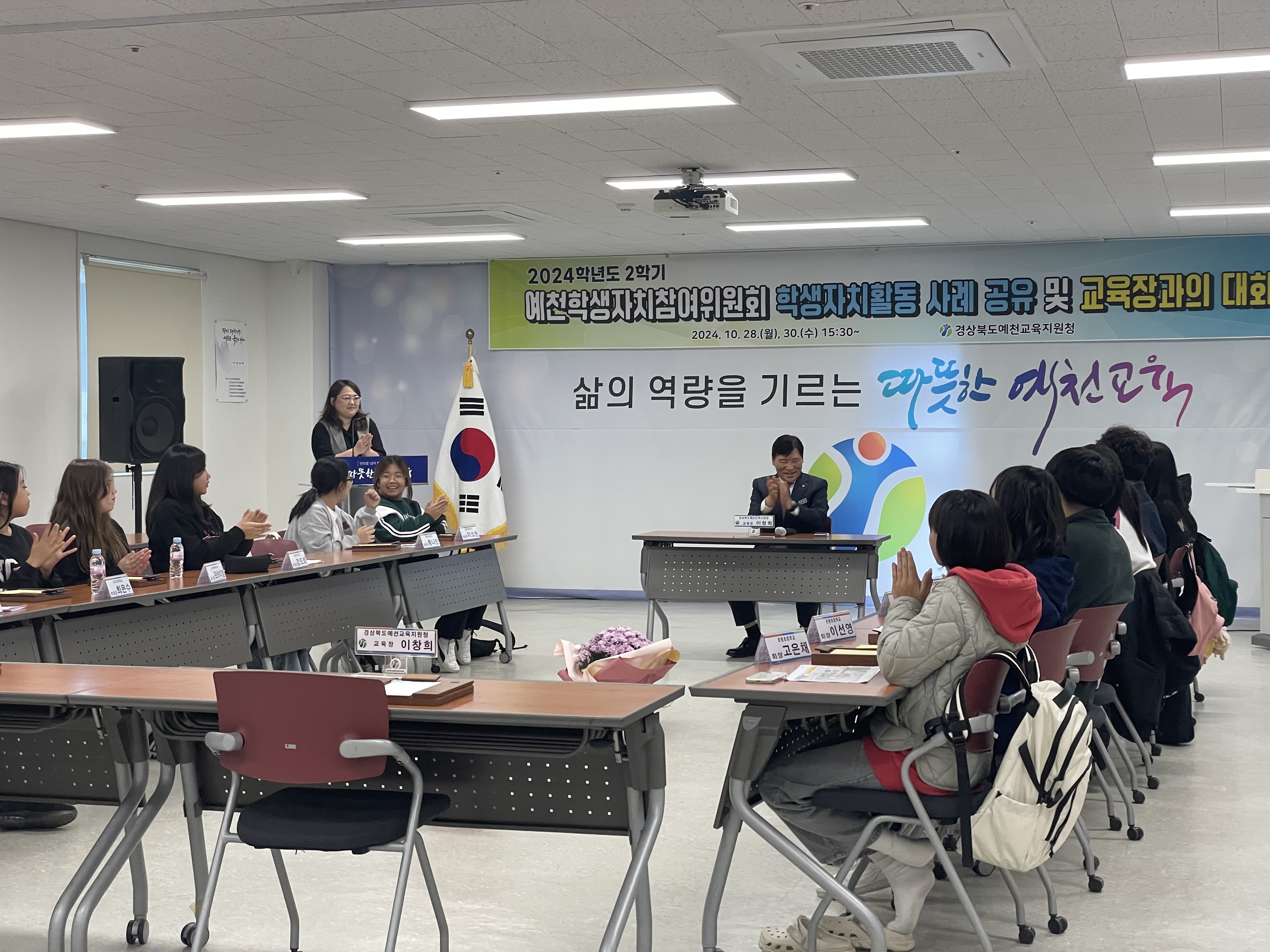 □ 예천교육지원청(교육장 이창희)은 10월 28일(월), 10월 30일(수) 관내 초․중․고 학생회장, 부회장 48명을 대상으로 2024학년도 2학기 학생자치참여위원회를 실시하였다. 학생자치참여위원회를 통해 다양한 자치활동 사례를 공유하고 교육장과의 소통의 장을 마련하였다.