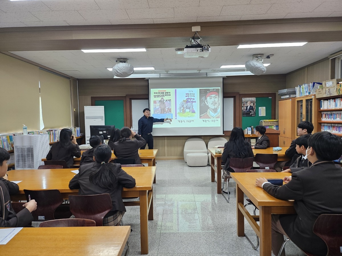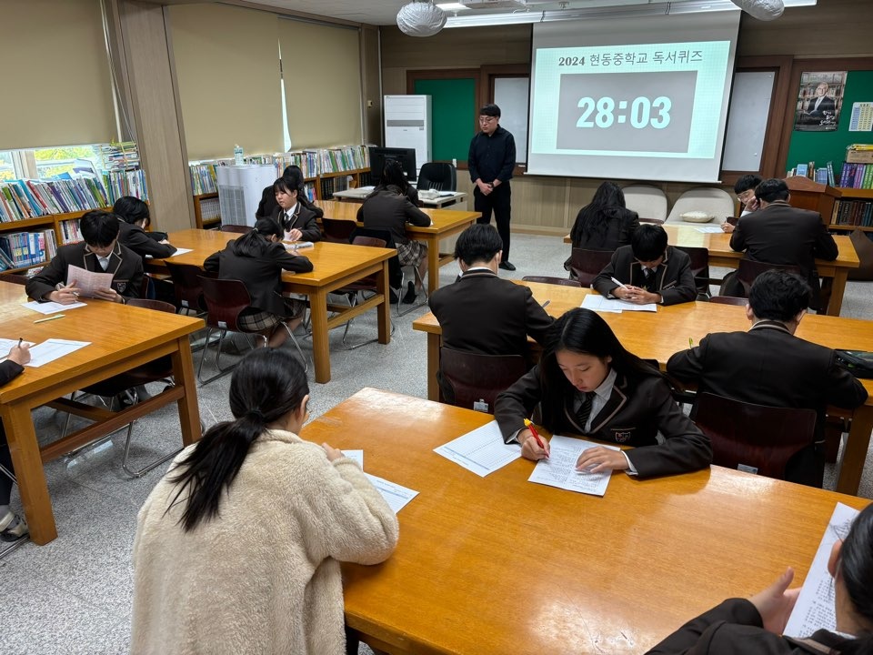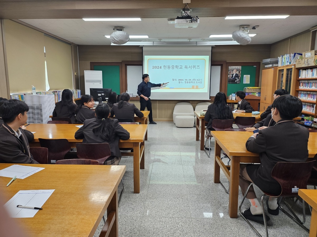 - 현동중학교(교장 김양훈)는 10월 29일(화) 4교시에 본교 도서관에서 전교생을 대상으로 독서 퀴즈 대회를 실시하였다. 진행은 본교 국어교사 박○○선생님이 진행하였다.