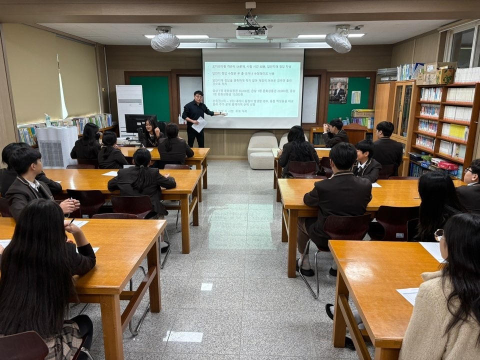 전교생은 제한시간을 두고 독서퀴즈 시험을 치는 형식으로 실시되었다. 활용된 책은 ‘ 우리 반 애들 모두가 망했으면 좋겠어(이도해)’, ‘옛일을 들려주고 의미를 깨쳐주는 성장기 고사성어(윤병무)’, ‘박시백의 조선왕조실록 1 개국(박시백)’ 총 3권으로 하였으며 문제별 난이도를 구분해 동점자의 경우 고난이도 문제를 더 많이 맞힌 순서로 순위를 가렸다.