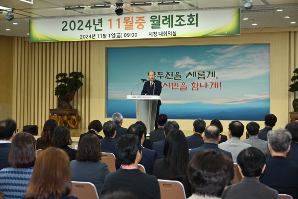 [금요저널] 동두천시는 1일 시청 대회의실에서 11월 중 명예시장으로 위촉된 김홍석 한국농촌지도자 동두천시 연합회장과 전 직원이 참석한 가운데 월례조회를 개최했다.