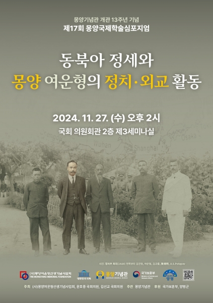 오는 27일 오후 2시부터 국회의원회관 2층 제3세미나실에서 열리는 제17회 몽양국제학술심포지엄"동북아 정세와 몽양 여운형의 정치·외교 활동"은 몽양 선생의 자주독립과 평화통일 사상을 바탕으로 한 중국, 일본, 러시아와의 다각적인 정치·외교 활동사를 밝히는 한편 현재 변화하는 동북아 정세 속에 대한민국이 나아갈 방향을 모색하고자 한다.