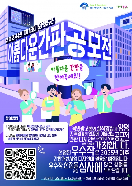[금요저널] 양평군은 지역의 도시미관을 개선하고 개성 넘치는 옥외광고 문화를 조성하기 위해 개최한 ‘2024년 제1회 양평군 아름다운 간판 공모전’ 출품 전시회를 11월 25일부터 12월 6일까지 양평군청 본관 1층 로비에서 개최한다고 밝혔다.