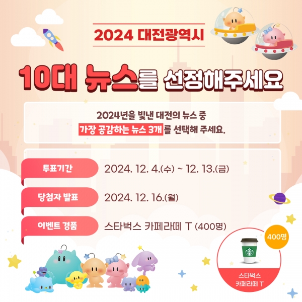 [금요저널] 대전시는 올 한 해 다양한 시정 성과 중 시민들의 공감을 얻은 뉴스를 선정하기 위해 4일부터 13일까지 ‘2024년 대전시정 10대 뉴스’ 투표를 진행한다.