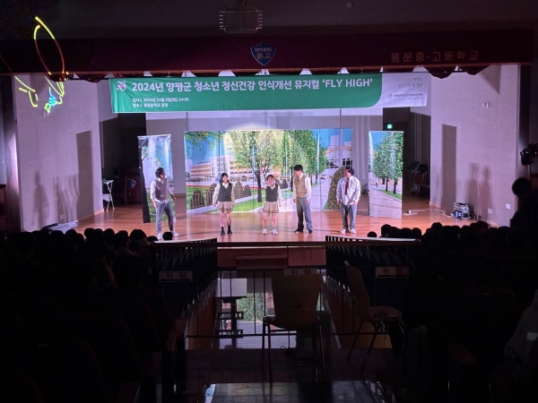 [금요저널] 양평군은 용문중학교 학생들을 대상으로 정신건강 인식개선 및 학교폭력 예방을 위해 3일 용문중학교 강당에서 청소년 정신건강 인식개선 뮤지컬 ‘FLY HIGH’ 공연을 선보였다.