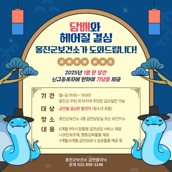 [금요저널] 옹진군은 새해맞이 금연 결심 실천의 성공을 돕기 위해 1월 한 달간 금연클리닉 신규 등록자에 한해 기념품을 제공하는 이벤트를 진행한다고 밝혔다.