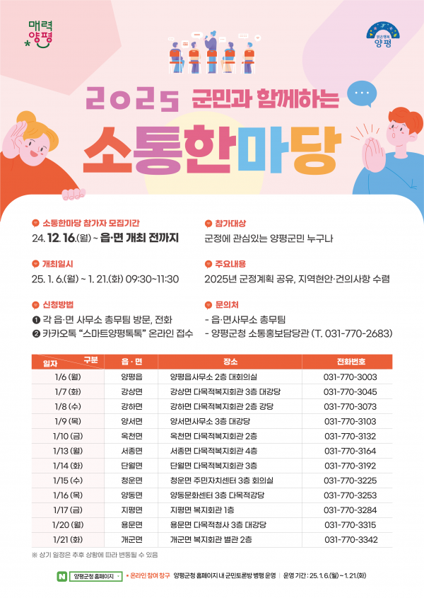 이번 소통한마당은 6일 양평읍을 시작으로 22일 단월면까지 12일간 읍·면을 방문해 진행될 예정으로 2025년 민선8기 군정 운영 방향과 주요사업 설명, 주민과의 대화를 통한 건의사항과 정책 제안 청취 등 양방향 소통의 장이 펼쳐진다.