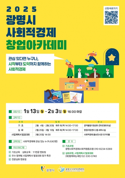 [금요저널] 광명시는 오는 2월 3일까지 사회적경제에 관심 있는 시민과 예비 창업자를 대상으로 ‘2025년 광명시 사회적경제 창업 아카데미’ 수강생을 모집한다.