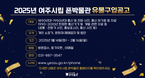 [금요저널] 여주시의 여주시립 폰박물관에서는 1980년대부터 1950년대의 통신 관련 자료와 1960년대부터 2010년대까지의 한정판 통신기기를 구입하기 위해2025년도 유물 공개 구입을 진행한다.