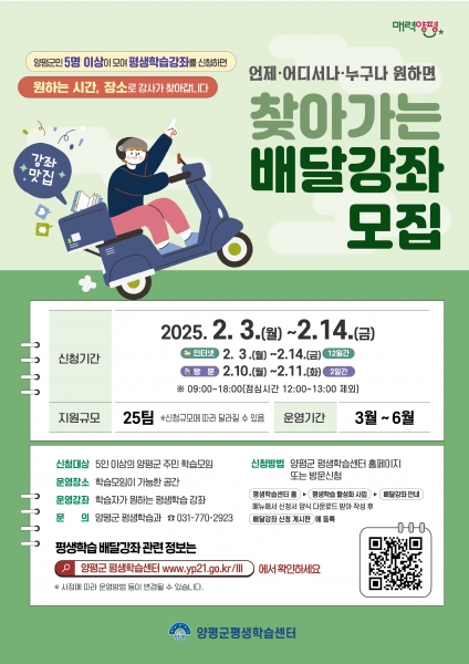[금요저널] 양평군은 오는 2월 3일부터 2월 14일까지 양평군 학습모임을 대상으로 2025년 찾아가는 배달강좌에 참여할 학습자를 모집한다고 밝혔다.