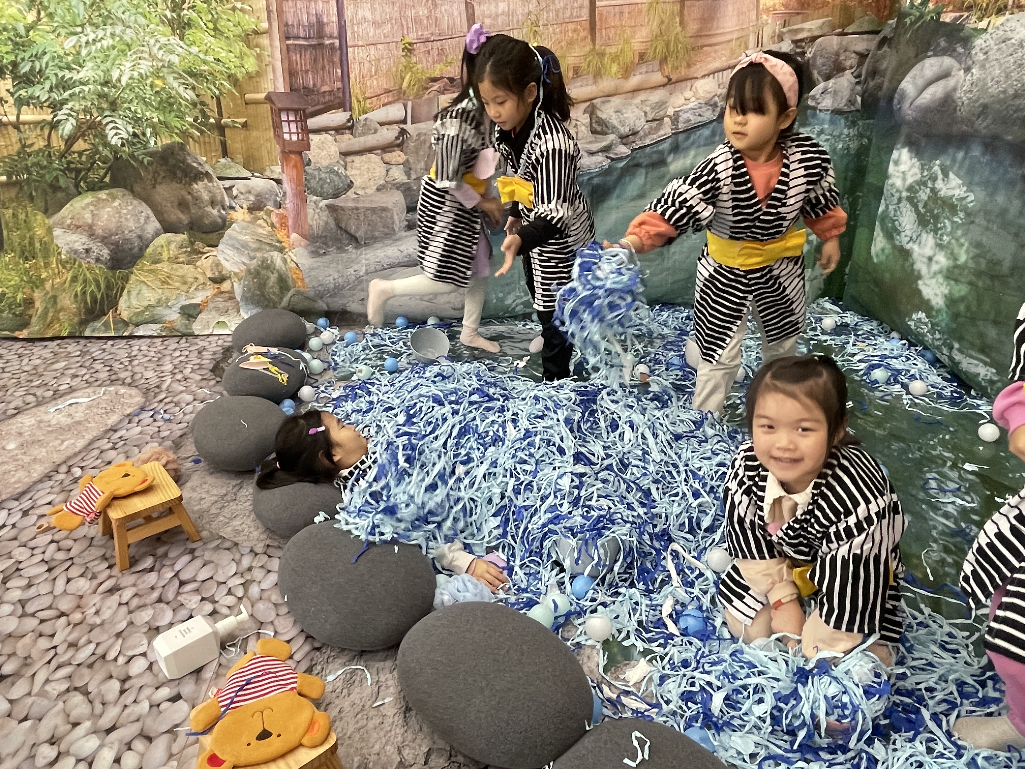□ 일본 온천놀이 체험은 유아들이 일본의 온천 문화에 대해서 놀이를 통해 간접적으로 체험하며, 다양한 문화를 이해하고 존중하는 태도를 배우는 것을 목표로 했다. 또한, 물놀이와 음식 놀이를 통해 유아들의 창의력과 감각 발달을 도모하며 즐거운 경험을 통해 정서적 안정을 제공했다.