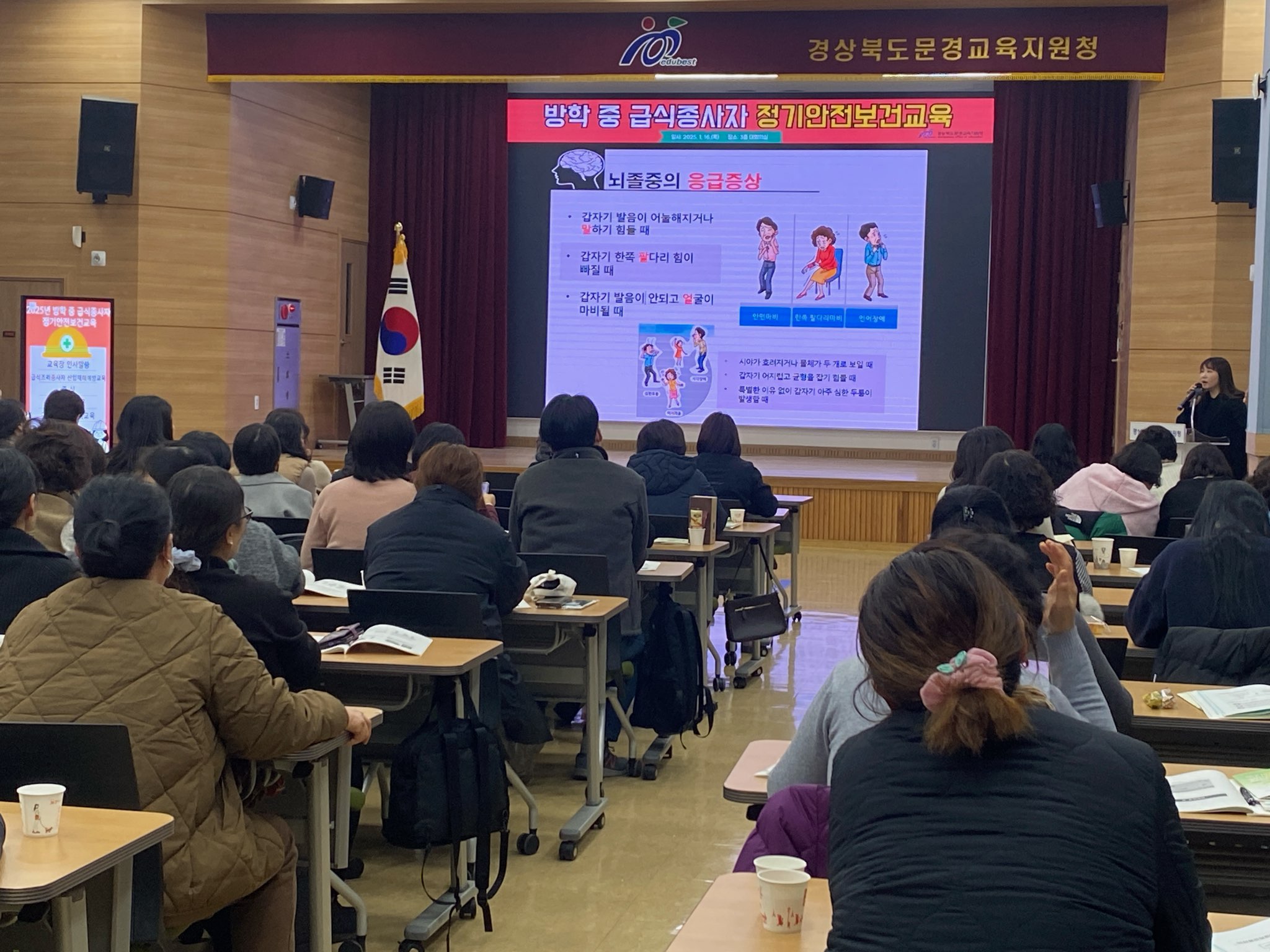 경상북도문경교육지원청(교육장 이경옥)은 지난 1. 16.(목) 관내 공·사립 유·초·중·고등학교 급식종사자(조리사, 조리원) 90여 명을 대상으로 정기안전보건교육을 실시했다고 밝혔다.
