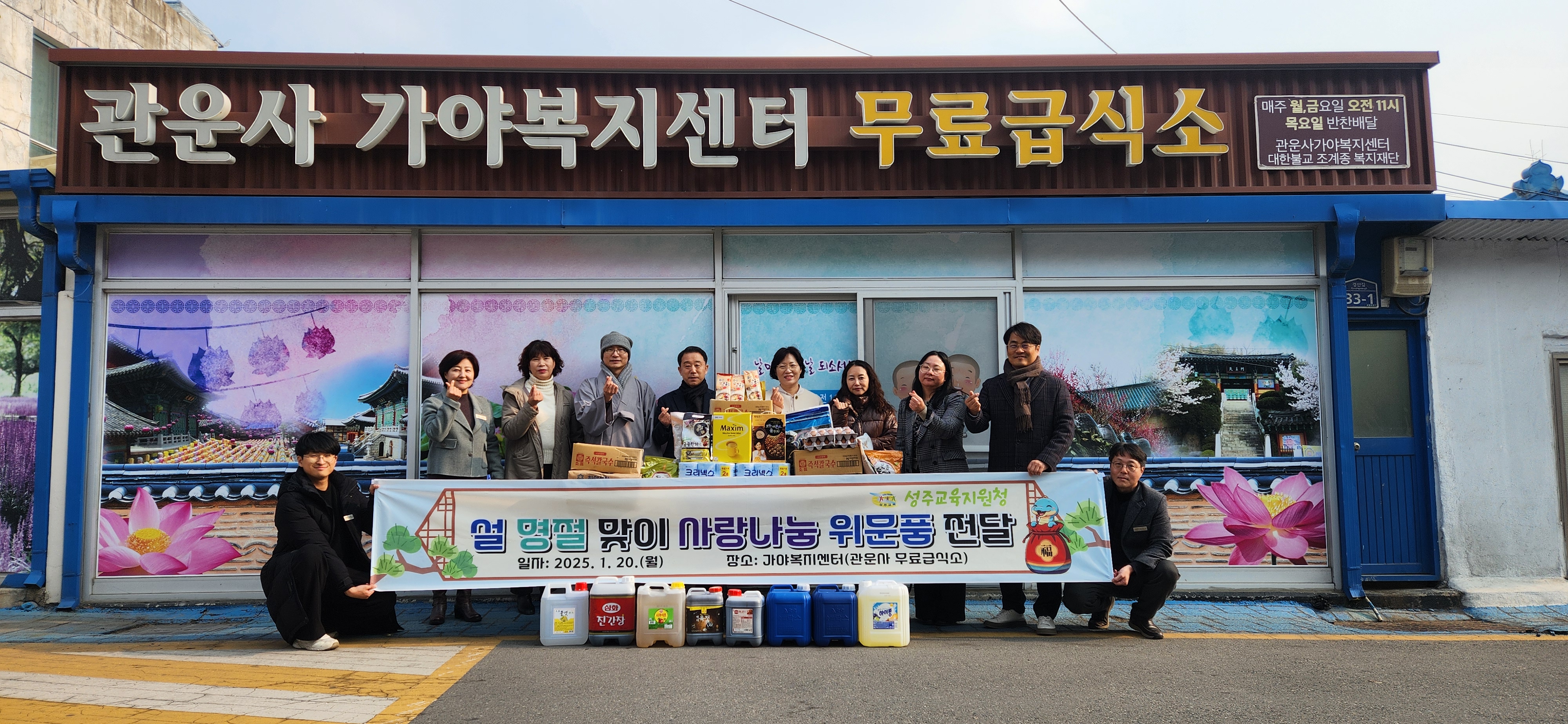 □ 경상북도성주교육지원청(교육장 정수권)은 1월 20일(월) 가야복지센터(관운사 무료급식소)를 방문해 사회복지시설 종사자들의 노고에 감사의 마음을 전하며 위문품 전달식을 가졌다.
