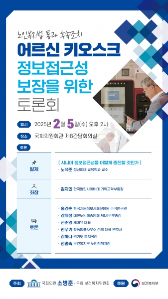 국회 보건복지위원회 소속 소병훈 국회의원은 오는 2월 5일 국회의원회관 제8간담회의실에서 ‘노인복지법 통과 후속조치- 어르신 키오스크 정보접근성 보장을 위한 토론회‘를 개최한다고 밝혔다.
