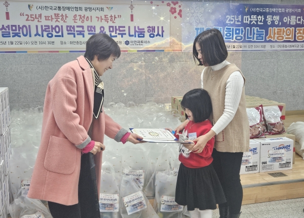 [금요저널] 한국교통장애인협회 광명시지회는 22일 하안종합사회복지관 3층 대강당에서 ‘제7회 설맞이 사랑의 떡국떡·만두 나눔 행사’ 와 ‘제3회 희망나눔 사랑의 장학금 전달식’을 개최했다.