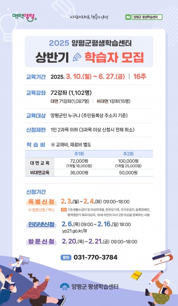 인터넷 신청은 2월 6일부터 16일까지 일반 학습자를 대상으로 진행되며 양평군 평생학습센터 홈페이지에서 신청할 수 있다.