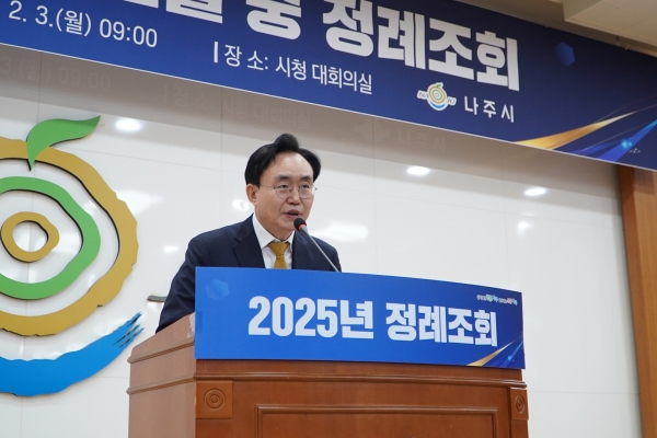 [금요저널] 전라남도 나주시는 지난 3일 대회의실에서 윤병태 시장을 비롯해 부시장, 국·소·실장, 직원 등 180여명이 참석한 가운데 2월 정례조회를 개최했다.