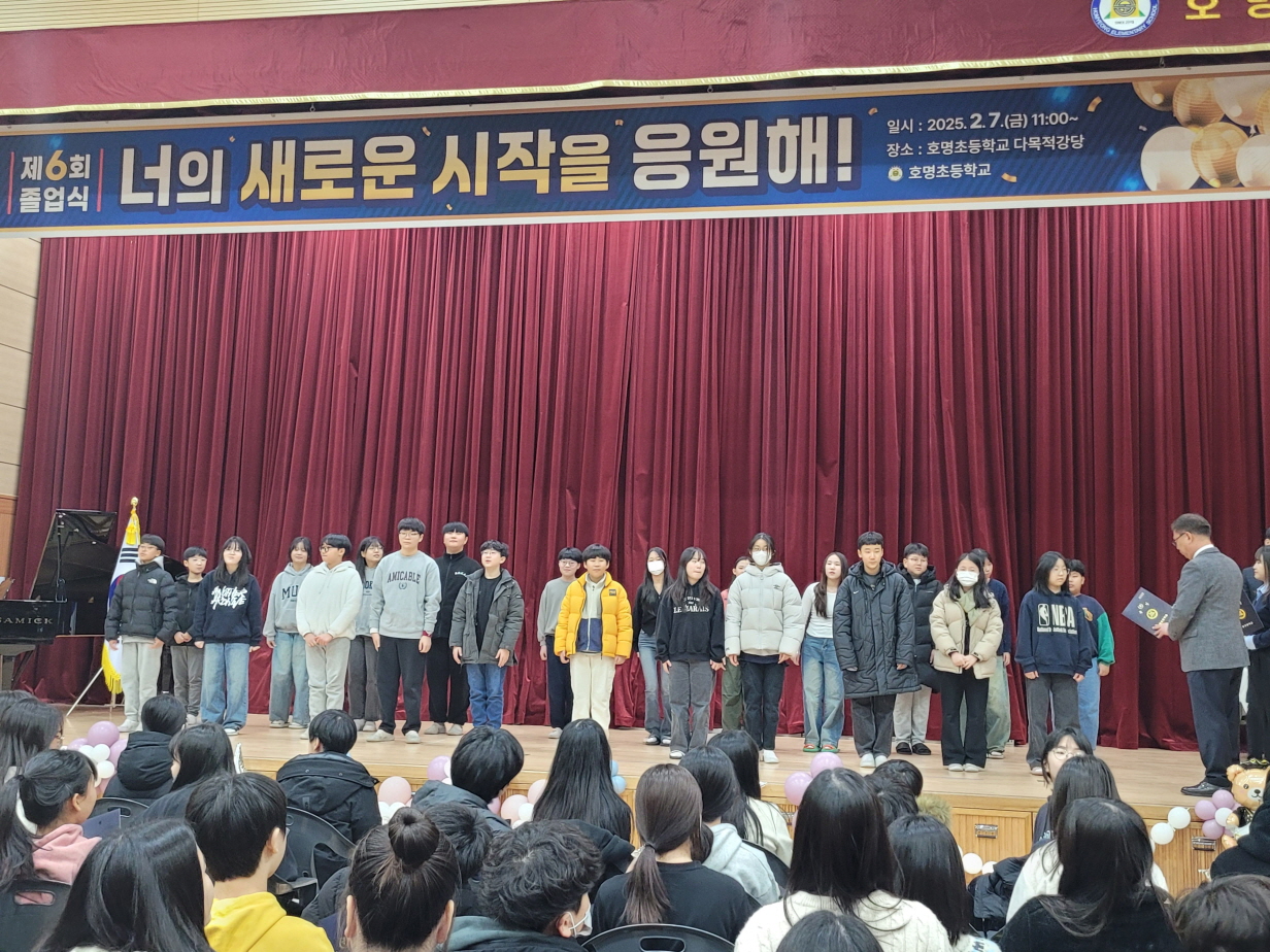 □ 호명초등학교(교장 이성태)는 2월 7일(금) 오전 11시, 다목적 강당에서 제6회 졸업식을 개최하였다. 이번 졸업식은 졸업생 202명과 내빈, 학부모 등이 참석하였다.