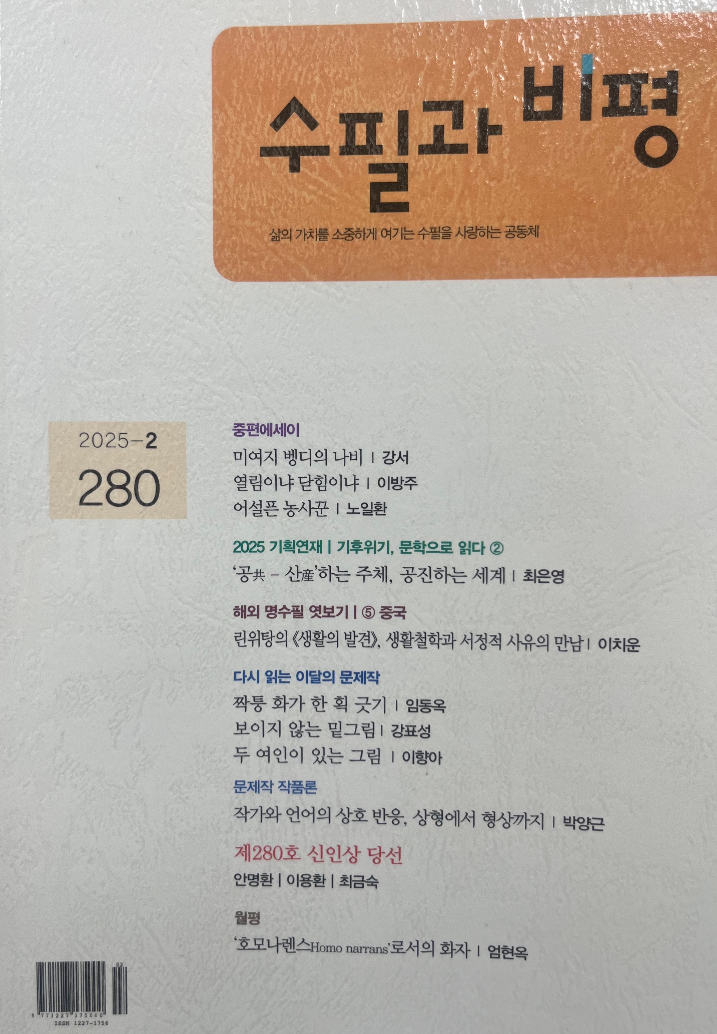 한편, ‘수필과 비평 올해의 작품상’은 매년 참신한 작품을 발굴하여 신인 작가를 배출하는 권위 있는 문학상으로, 이번 수상을 계기로 안 교장의 향후 작품 활동에도 큰 기대가 모이고 있다.